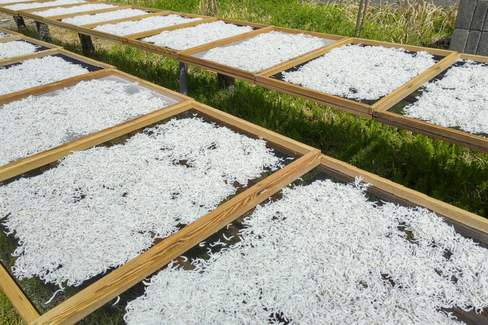 風が吹いているので金曜日の漁で作った釜揚げしらすを、しらす干しに仕立ててます。