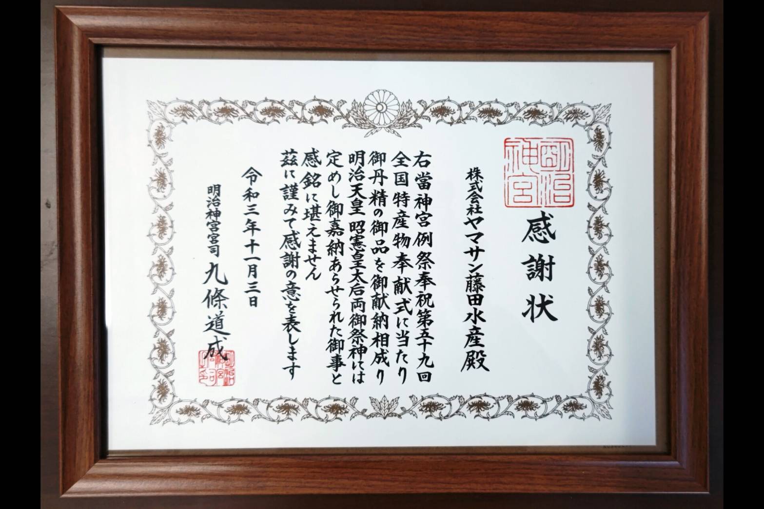 明治神宮さんから秋の大祭に奉献したことへの感謝状をいただきました!