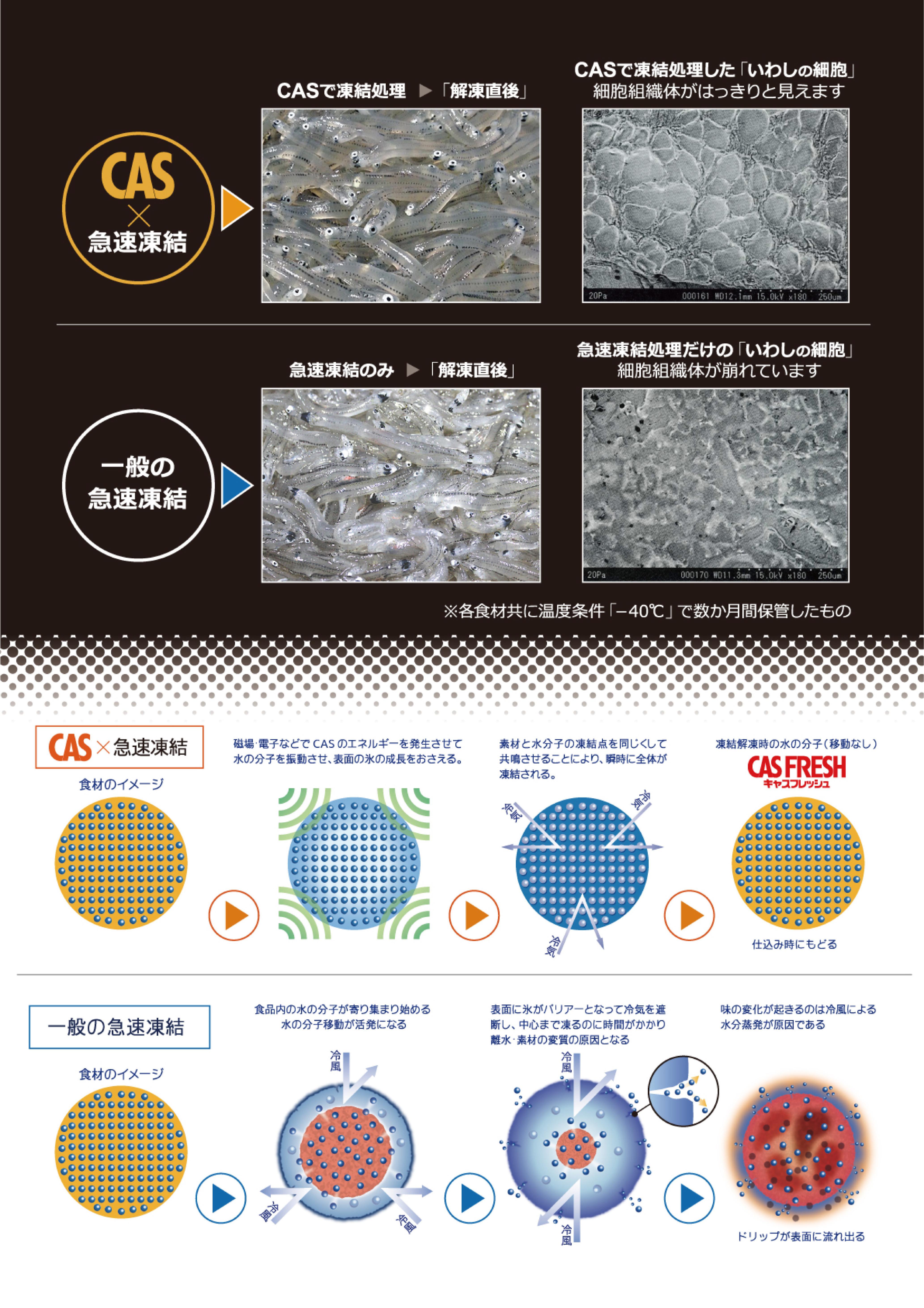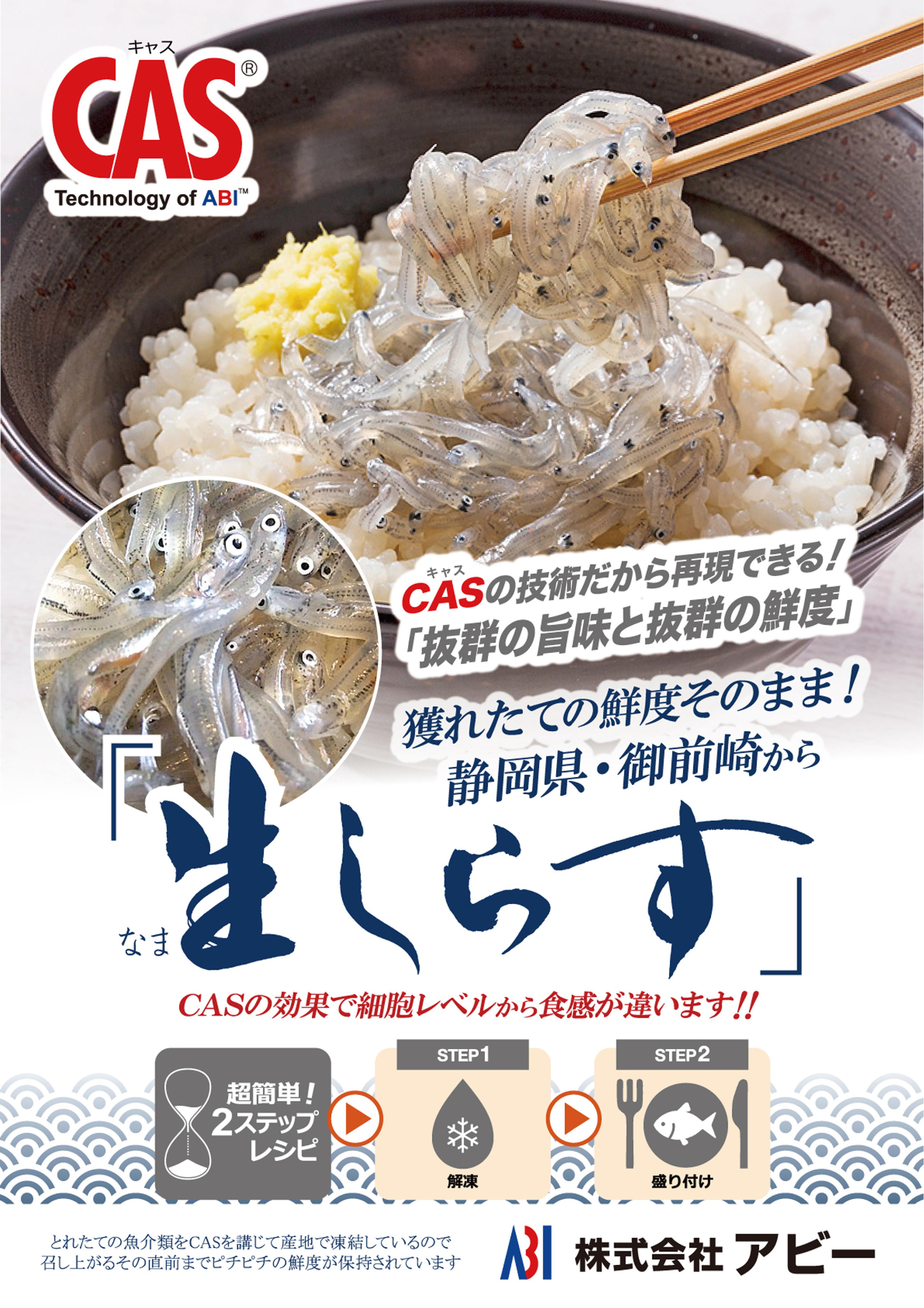 当店の冷凍生しらすはCASという特別な凍結技術を使い、しらすの鮮度を保持しています。