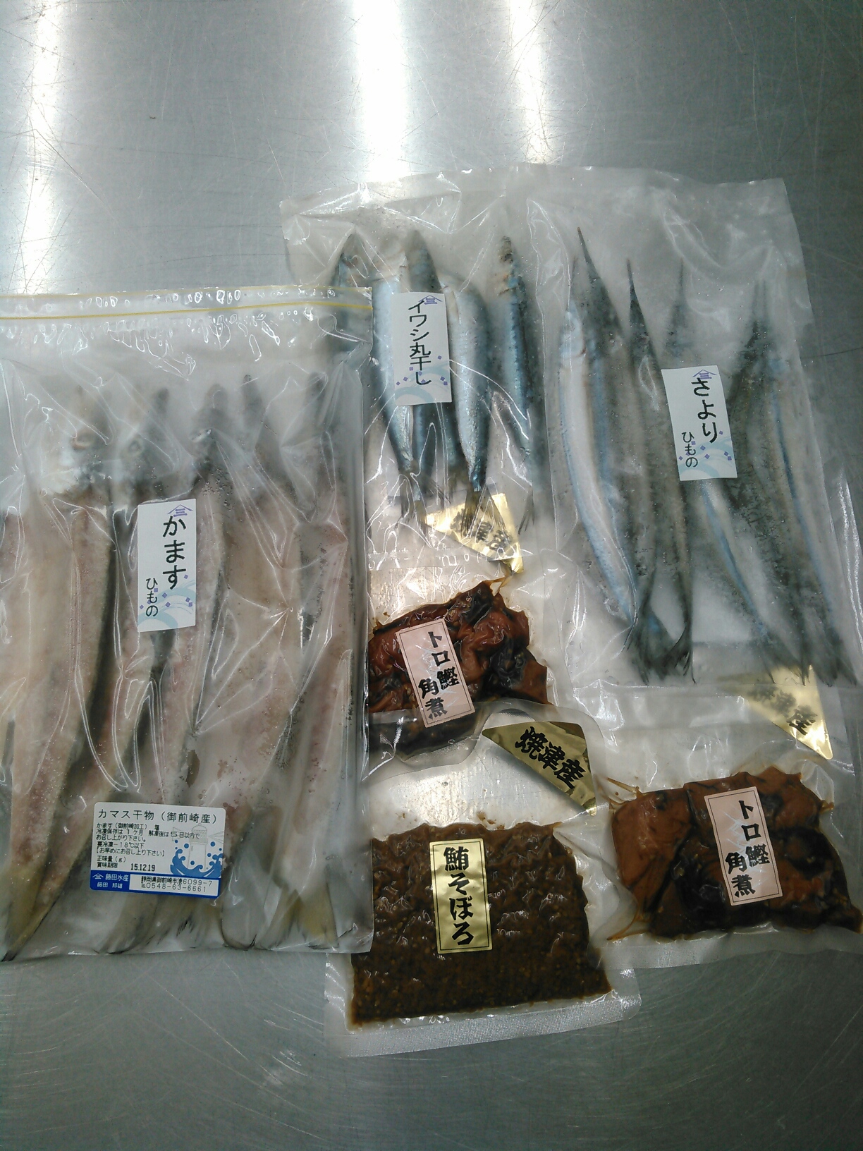 カマス干物(5枚)、イワシ丸干し(5~6本入)、サヨリ干物(7~8本入)、カツオ・マグロの角煮、鮪そぼろ煮、写真には写っていませんが釜揚しらすパック(250g)としらす干しパック(約200g)が入ります。