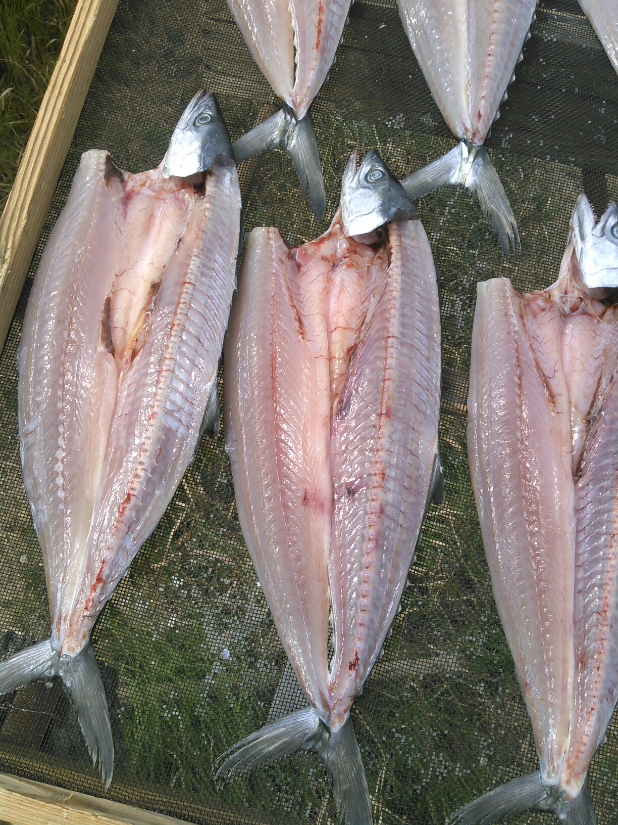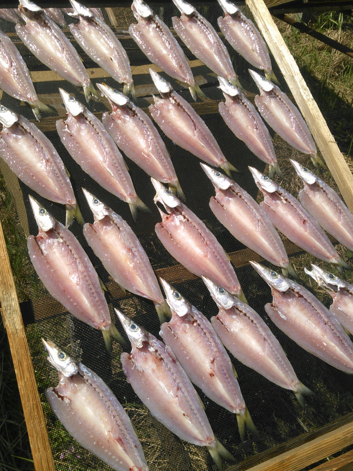 写真に写ってる包丁、干物を作るときに最もよく使っているモノです。刃長12cm程度。厚みは柳葉包丁より薄く両刃です。