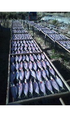 先日は「カマス」と「サヨリ」の干物作りをしました。写真は開いたカマスを天日干ししているところです。